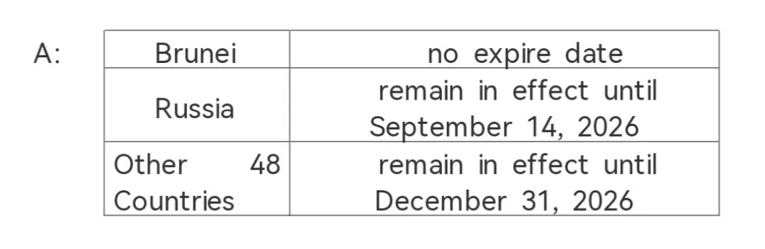 A: Nationals holding valid ordinary passports of 50 countries, namely Brunei, France, Germany, Italy, Spain, the Netherlands, Switzerland, Ireland, Hungary, Austria, Belgium, Luxembourg, New Zealand, Australia, Poland, Portugal, Greece, Cyprus, Slovenia, Slovakia, Norway, Finland, Denmark, Iceland, Andorra, Monaco, Liechtenstein, the Republic of Korea, Bulgaria, Romania, Croatia, Montenegro, North Macedonia, Malta, Estonia, Latvia, Japan, Brazil, Argentina, Chile, Peru, Uruguay, Saudi Arabia, Oman, Kuwait, Bahrain, Russia, Sweden, Canada and UK are exempted from visa requirement if coming to China for the purpose of business, tourism, family or friends visits, exchange and transit. They can stay in China for no more than 30 days without a visa.