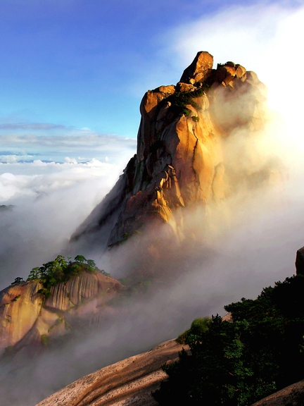 As the highest summit in the Jianghuai region, Tianzhu Peak stands at 1,489.8 meters above sea level. Its name, meaning "Heavenly Pillar," derives from its appearance as a colossal column holding up the sky. The summit bears inscriptions such as "Pillar of the Central Heaven" and "Lone Pillar Propping Up the Firmament." From the Worship Stone Platform below, visitors can also take in sweeping views of a sea of clouds and the Buddha's Halo phenomenon.