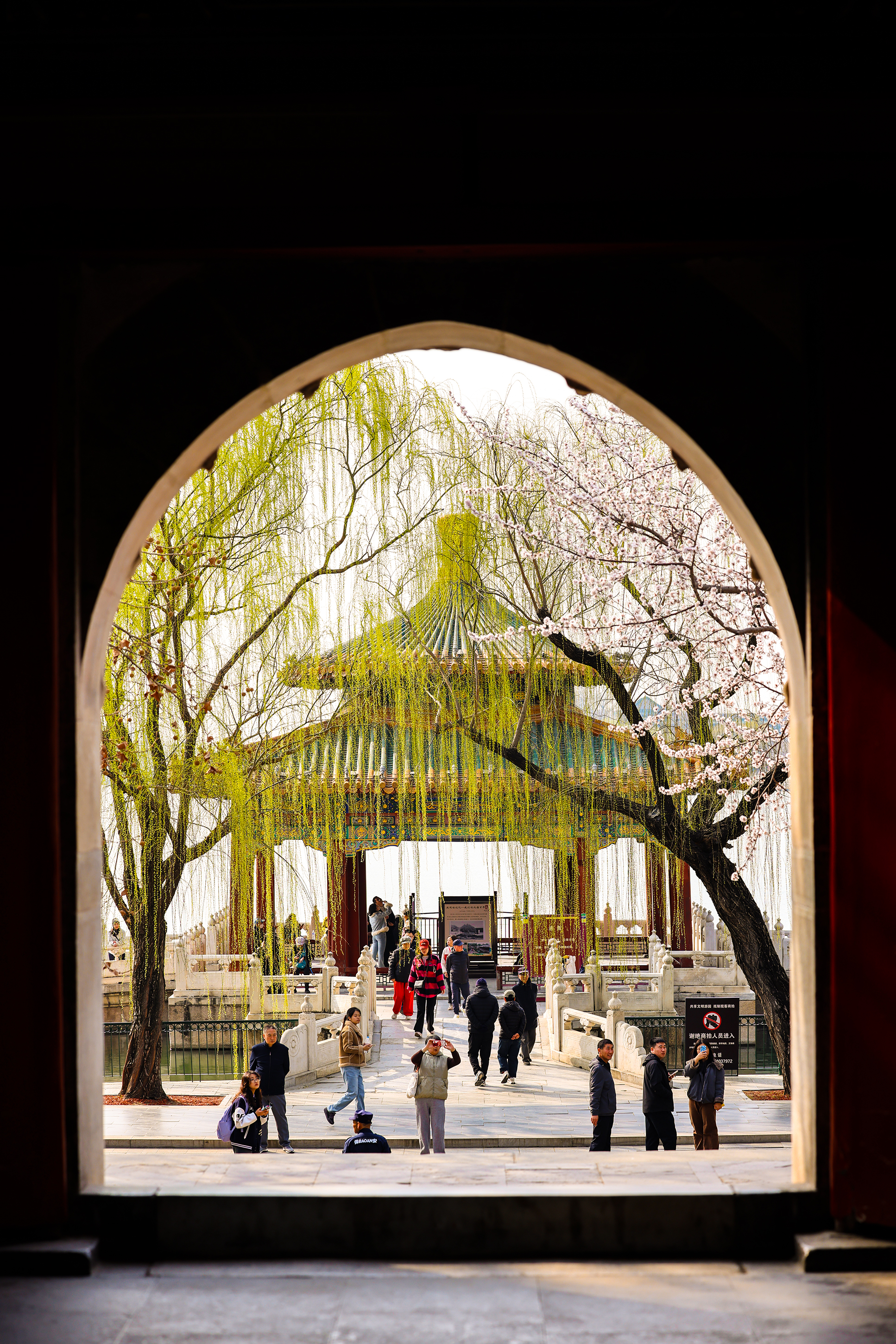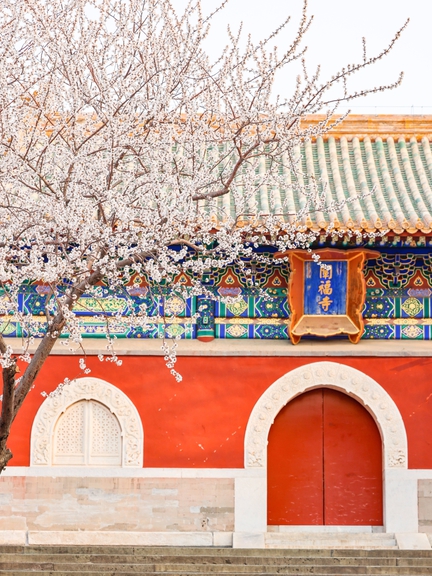 On March 22, mountain peach blossoms are in full bloom at Chanfu Temple in Beihai Park, Beijing, as visitors take photos outside the temple. Photo by Cao Xuewen