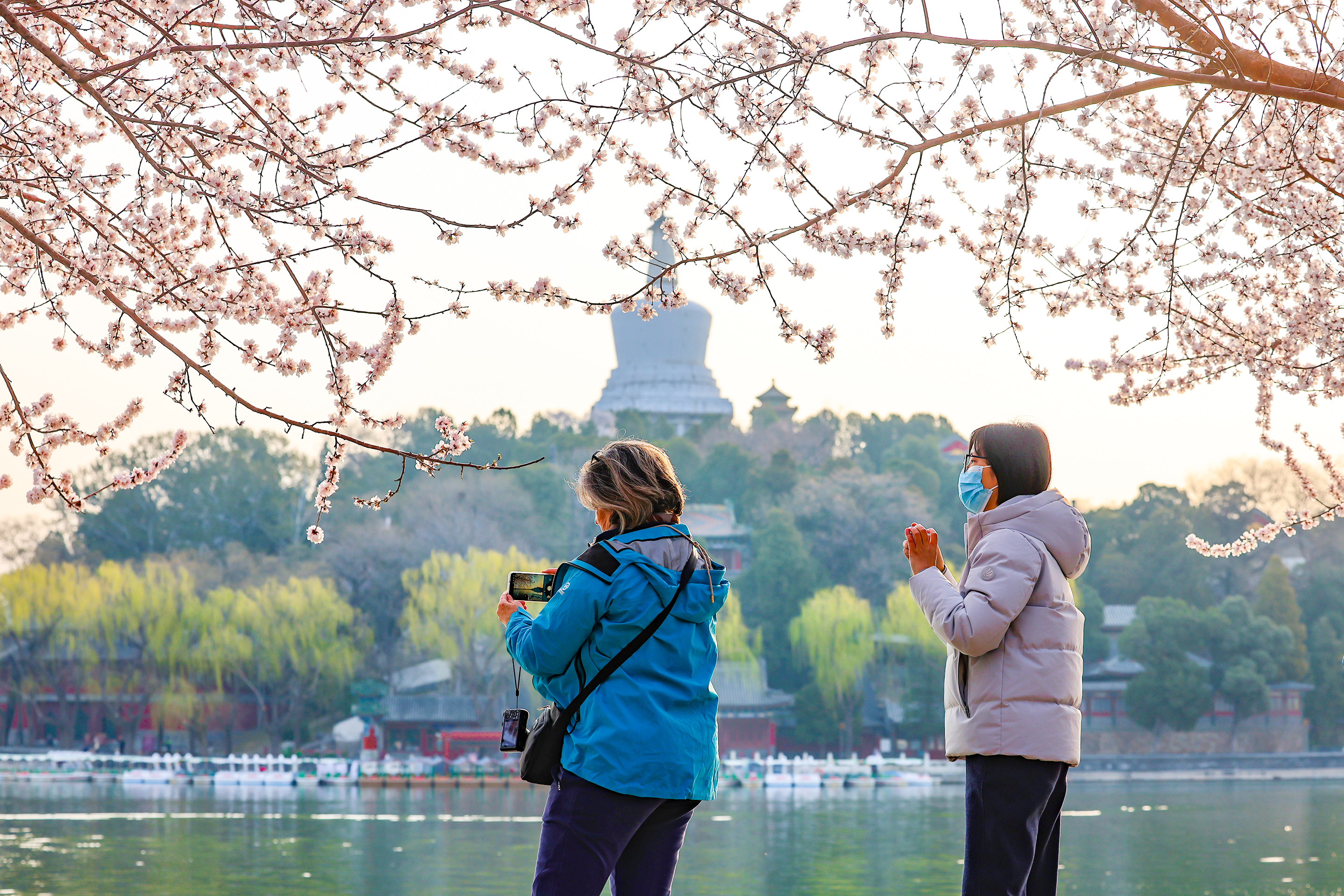 On March 22, the mountain peach blossoms in Beihai Park, Beijing, burst into full bloom. Pink-white petals set off the White Pagoda, intertwining with the rippling spring waters to form a picturesque scene, drawing many residents and visitors to take part in this romantic floral season.