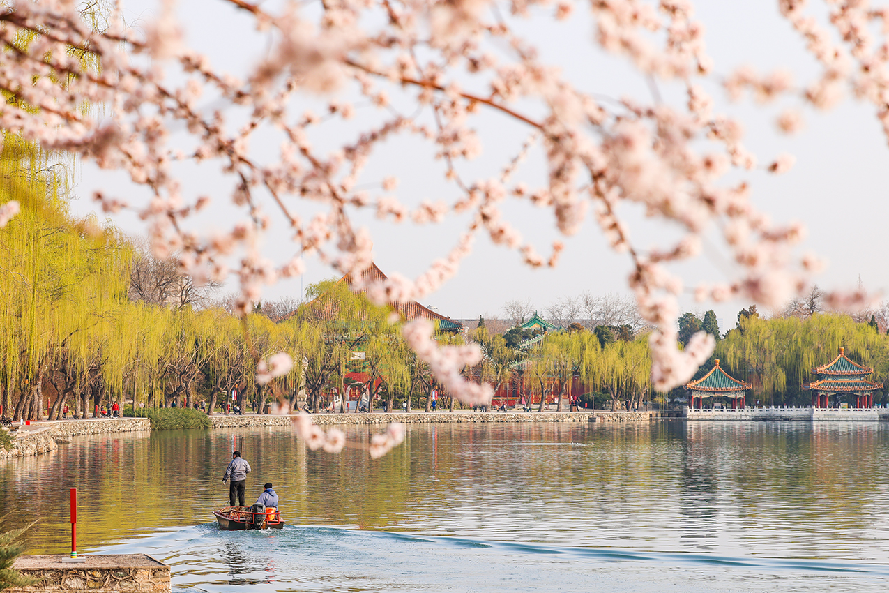 On March 22, in Beihai Park, Beijing, pink-white peach blossoms and spring waters come together in a picturesque scene. Photo by Cao Xuewen