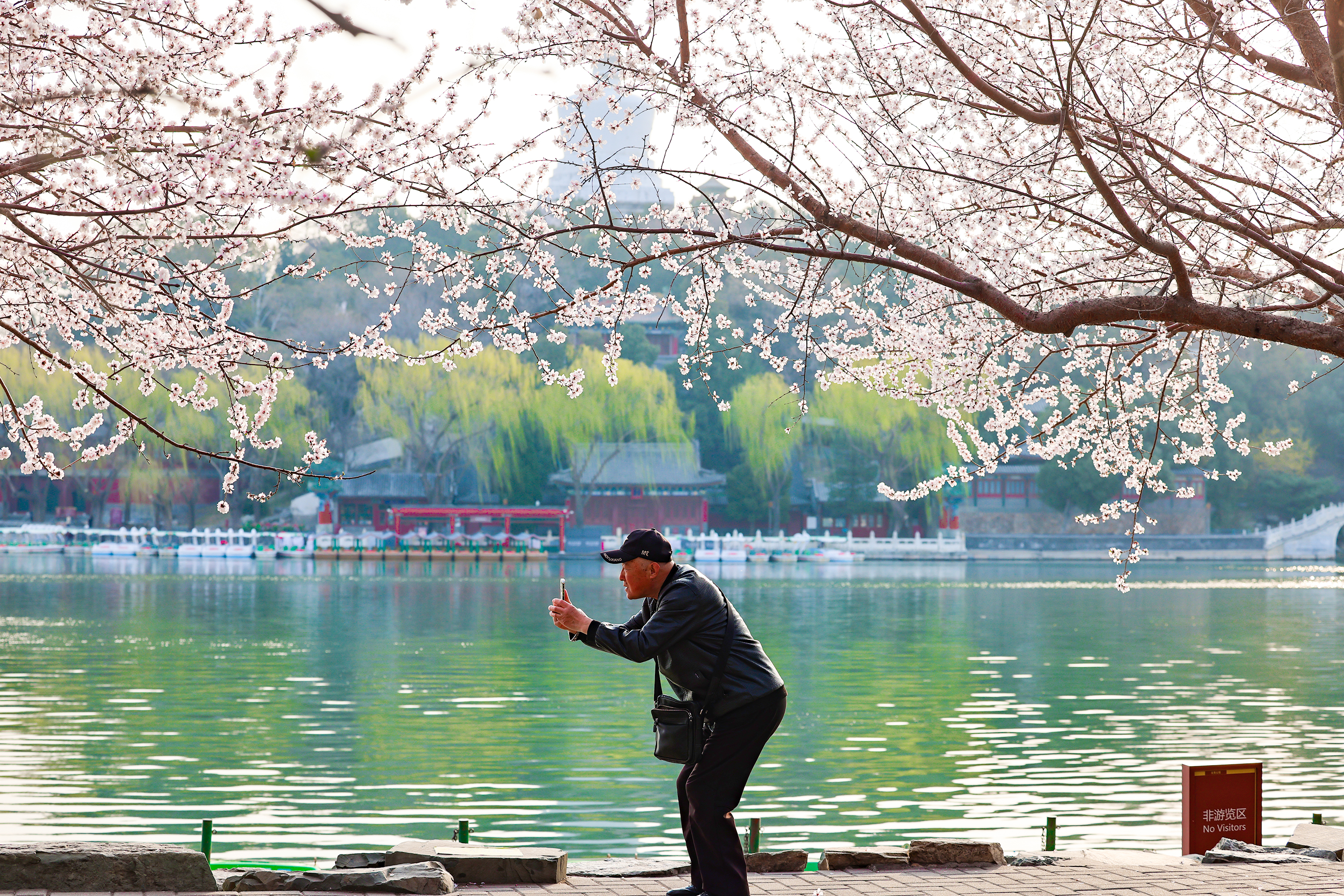 On March 22, visitors admire the blossoms and take photos beneath peach trees at the west shore pier of Beihai Park. Photo by Cao Xuewen